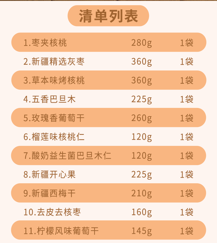 送禮有面 新疆特產(chǎn) 產(chǎn)地直發(fā) 棗夾核桃280g*1 精選新疆灰棗360g*1 草本味烤核桃360g*1 五香巴旦木225g*1 玫瑰香葡萄干260g*1 榴蓮核桃仁120g*1 酸奶益生菌巴旦木仁120g*1 開心果225g*1 新疆西梅干210g*1 去皮去核棗160g*1 檸檬風(fēng)味葡萄干145g*1 新疆印象·堅(jiān)果盛宴大號(hào)禮盒*1