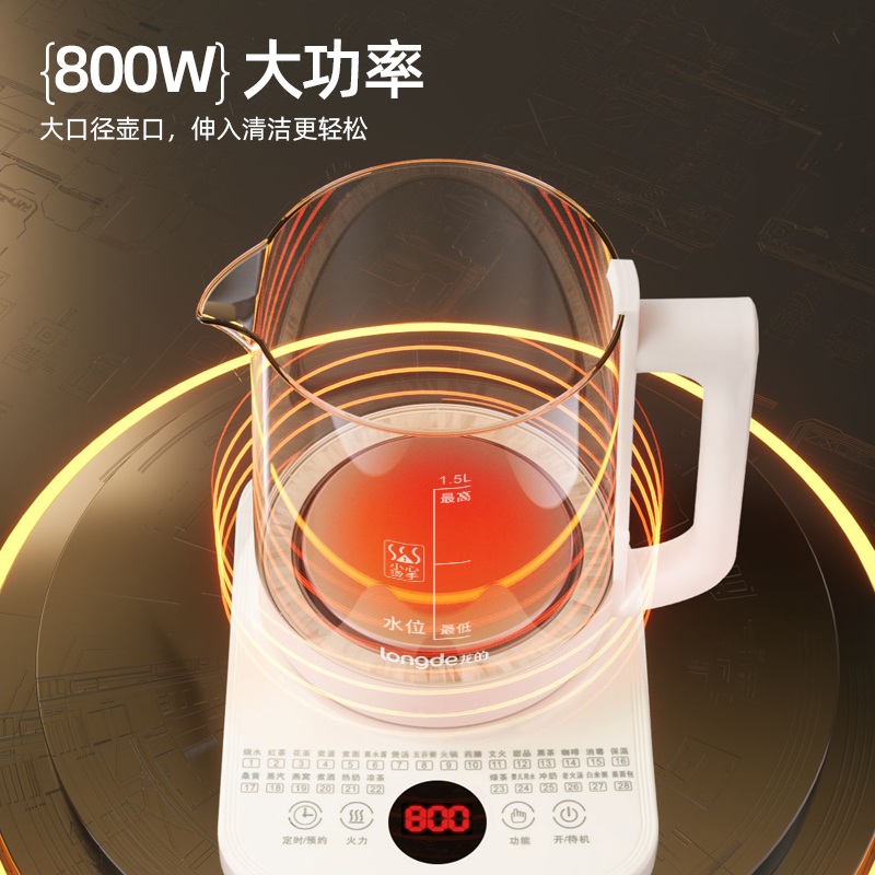 額定功率:800W 產(chǎn)品容量:1.5L 額定電壓:220V~ 產(chǎn)品頻率:50Hz 產(chǎn)品凈重:1.3kg 產(chǎn)品毛重:1.7kg 整箱重量:21.5kg 裝 箱 數(shù):12臺/箱 高硼硅玻璃壺身高硼硅玻璃冷熱交替不易裂 觸控菜單選擇二十八大觸控菜單選擇,數(shù)碼顯示,防干燒 功率可調(diào)8段功率可調(diào) 時間可調(diào)24小時預(yù)約,180分鐘定時可調(diào)