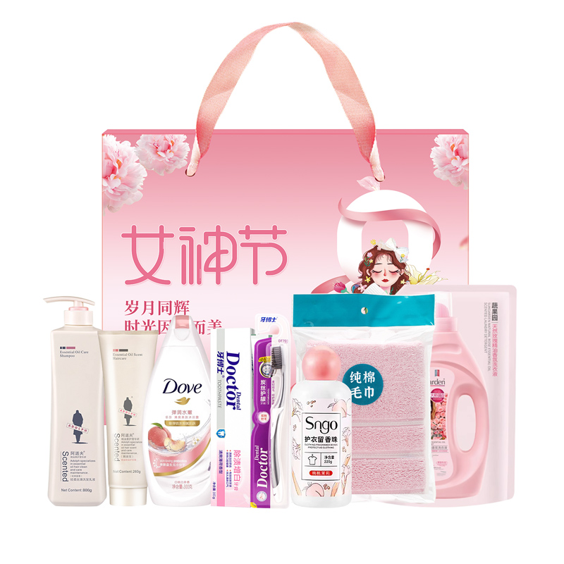 禮盒尺寸:32*8.5*24.5cm 包裝尺寸:66* 46.5*51 CM 產(chǎn)品配置:(香型隨機(jī)) 阿道夫洗發(fā)水300ml 阿道夫焗油寶260ml 多芬沐浴露300ml 蔬果園洗衣液500g 牙博士牙膏105g 牙博士炭絲護(hù)齦牙刷 純棉毛巾73*33cm 護(hù)衣留香珠220g 精美禮盒