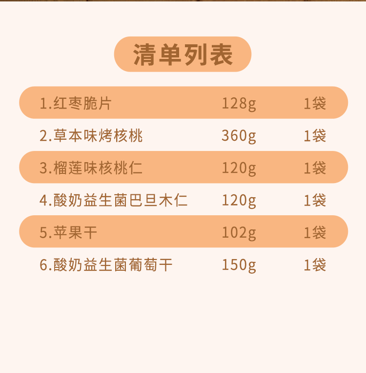 送禮有面 新疆特產(chǎn) 產(chǎn)地直發(fā) 紅棗脆片128g*1 草本味烤核桃360g*1 榴蓮核桃仁120g*1 酸奶益生菌巴旦木仁120g*1 蘋果干102g*1 酸奶益生菌葡萄干150g*1 新疆印象·堅果盛宴小號禮盒*1