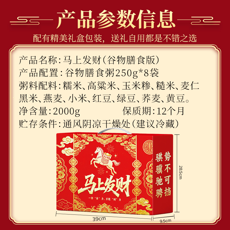 禮盒:馬上發(fā)財(cái) 產(chǎn)品規(guī)格配置:谷物膳食粥250g*8袋 盒尺寸:39*9.5*28.5cm 尺寸:60*40*30 箱體積:0.072方箱 重量:15.34kg 凈含量:2000g