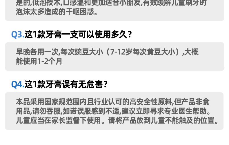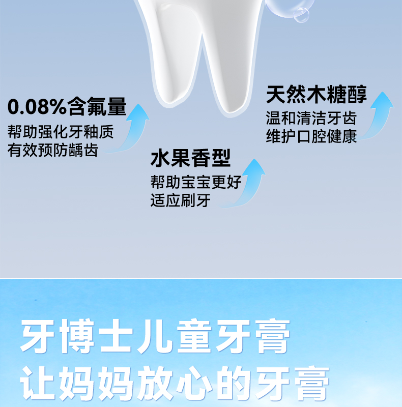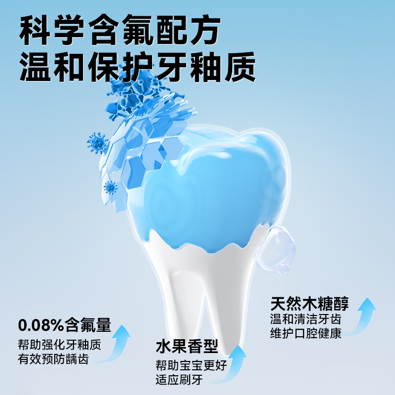 容量:50g 保質(zhì)期:3年 1.0.08%含氟量,幫助強(qiáng)化牙釉質(zhì)有效預(yù)防齲齒 2.水果香型,幫助寶寶更好適應(yīng)刷牙 3.溫和低泡,減少吞咽,媽媽安心 4.天然木糖醇,溫和清潔牙齒 維護(hù)口腔健康