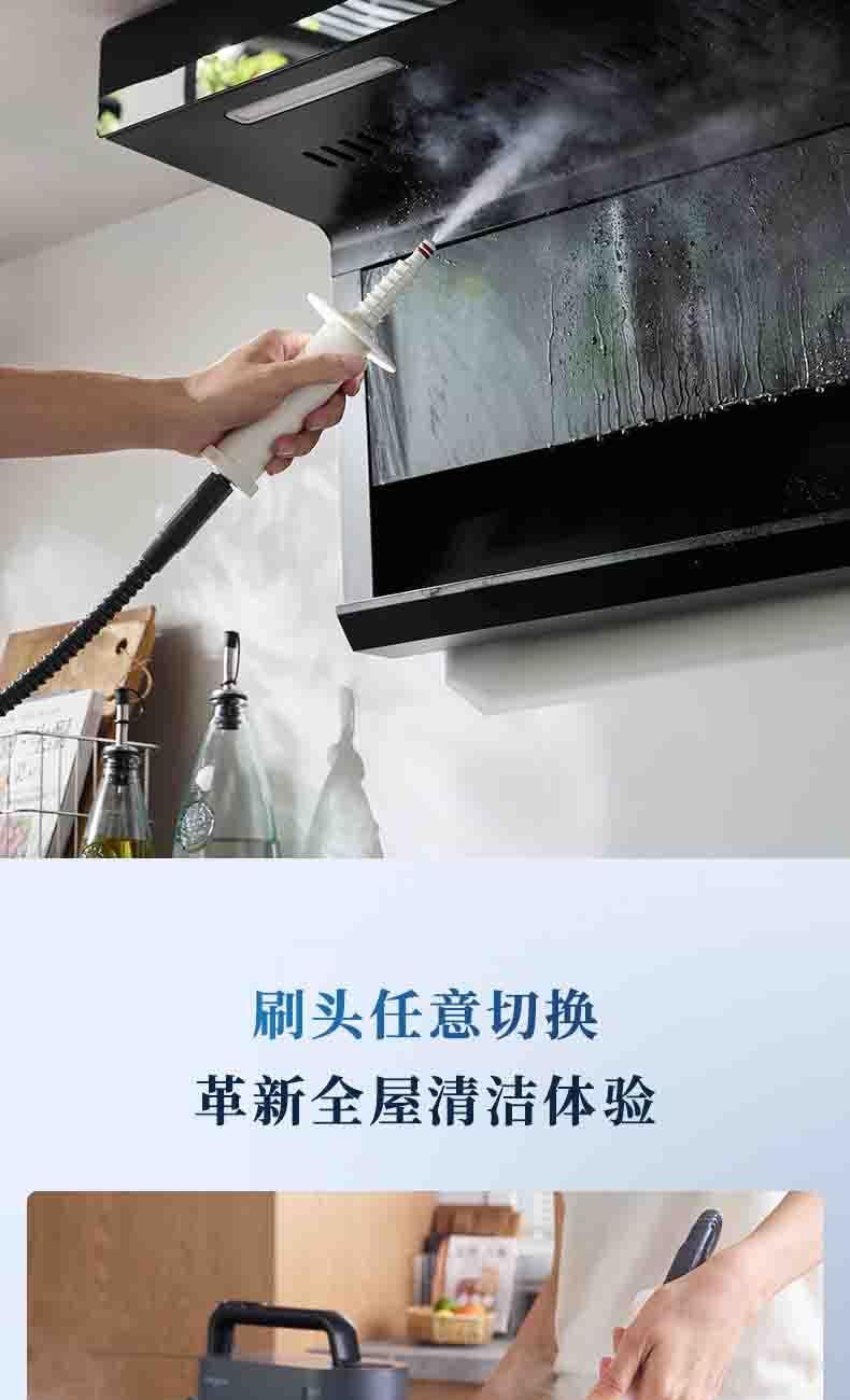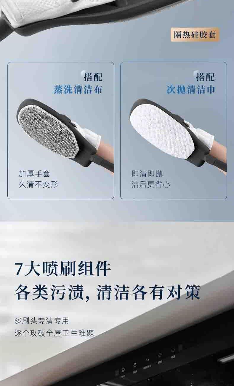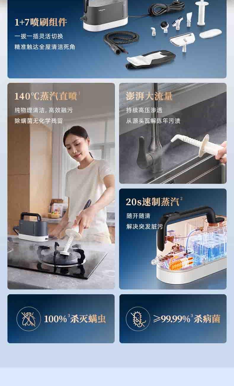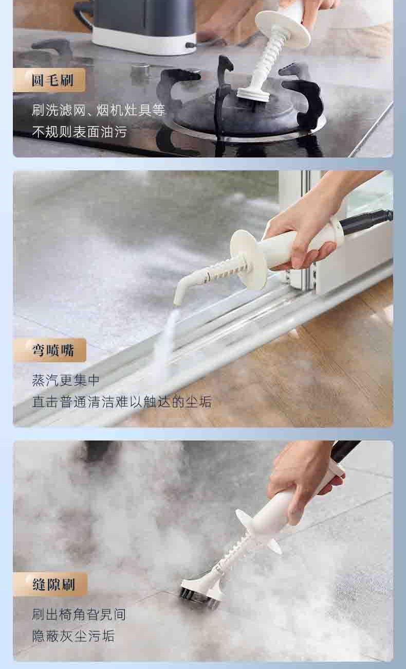 20秒140℃蒸汽3bar高壓直噴,純物理高效融污,除螨菌無殘留 澎湃大流量,持續(xù)高壓滲透,從源頭瓦解陳年污漬 1+7噴刷組件,精 準(zhǔn)觸達(dá)全屋清潔死角 4米電源線+1.3米延長軟管覆蓋每個(gè)角落