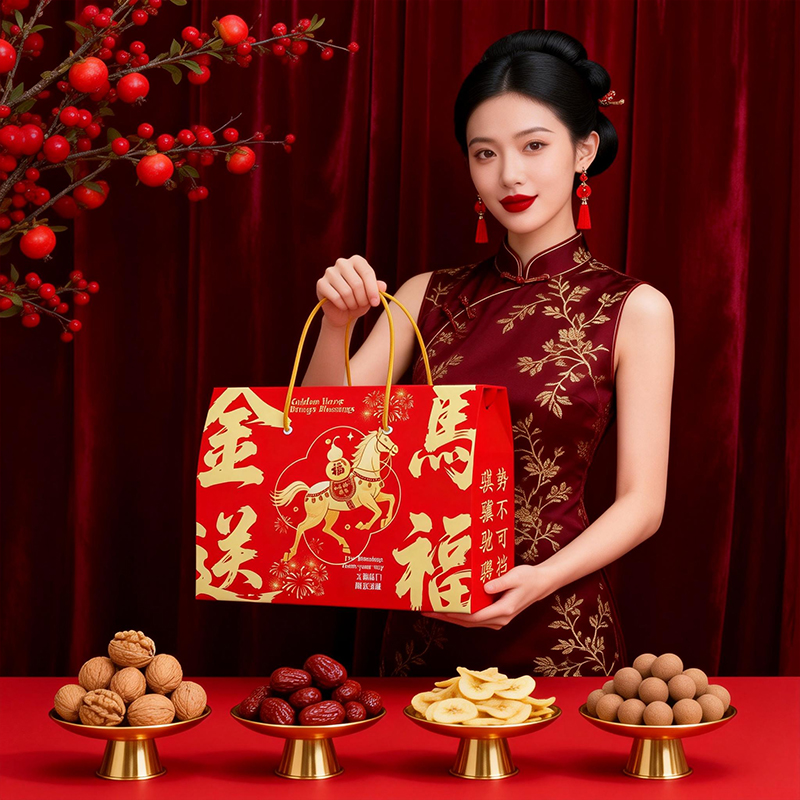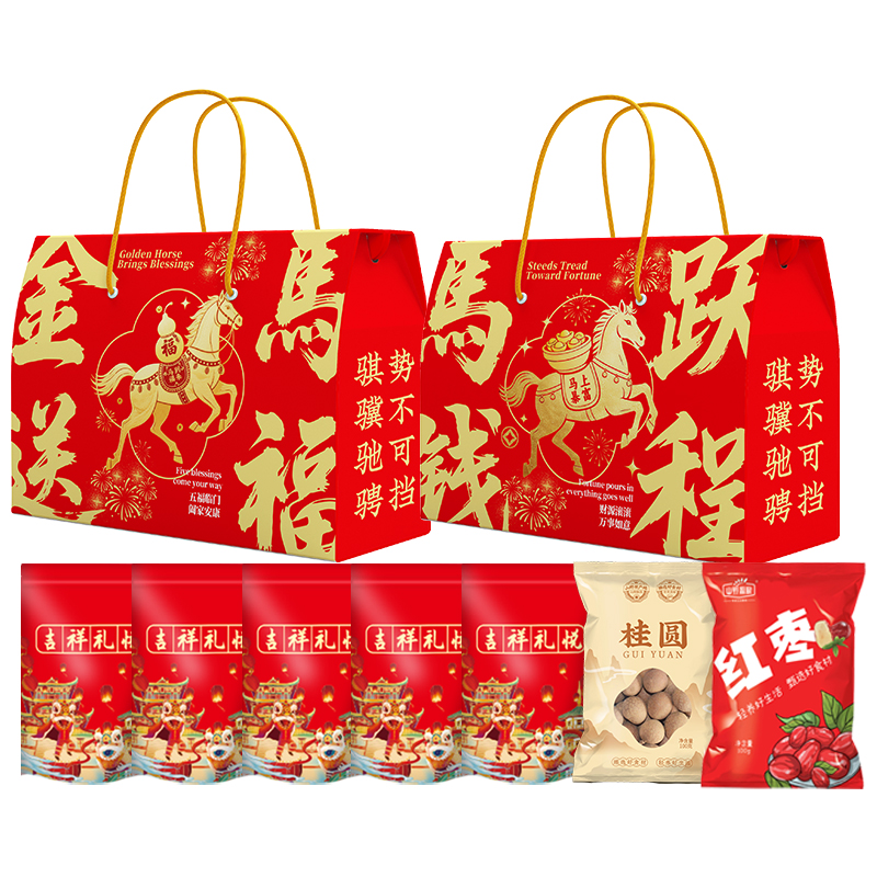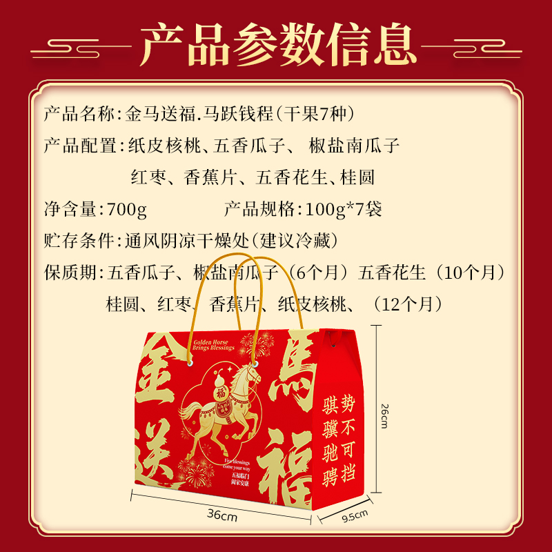 禮盒:金馬送福·馬躍錢(qián)程 凈含量:700g 產(chǎn)品規(guī)格配置:紙皮核桃、五香瓜子、桂圓、椒鹽南瓜子紅棗、香蕉片、五香花生(100gx7袋) 盒尺寸:36*26*9.5cm 箱尺寸:60*28*38 箱重量:6.6kg 箱體積:0.064方