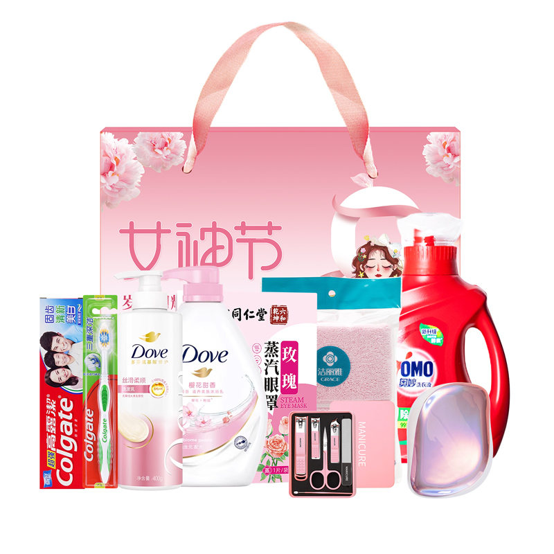 禮盒尺寸:34*8.5*27cm 包裝尺寸:69*37.5*56.5CM 產(chǎn)品配置:(香型隨機(jī)) 多芬洗發(fā)水400ml 多芬沐浴露550ml 奧妙洗衣液950g 高露潔牙膏90g 高露潔三重深潔牙刷 潔麗雅毛巾69*33cm 便攜順發(fā)氣囊梳 指甲刀套裝6件套 同仁堂蒸汽眼罩5貼/盒 精美禮盒