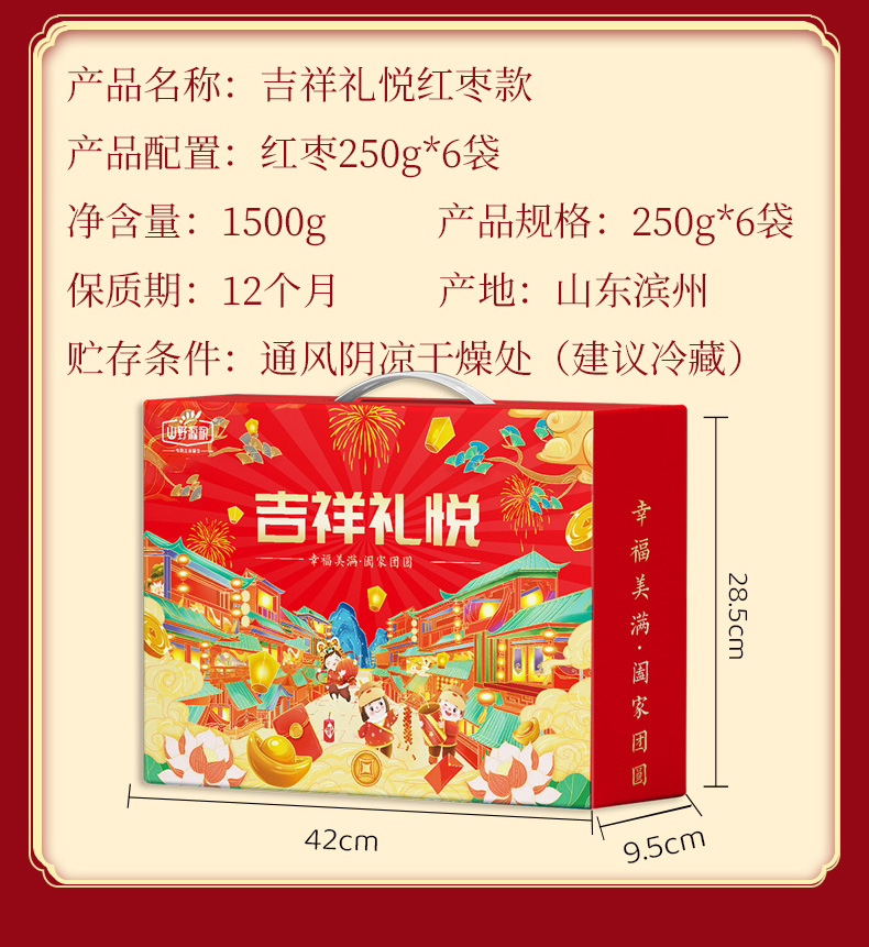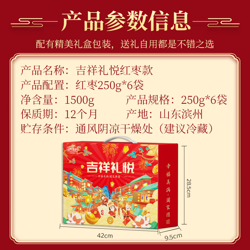 禮盒:吉祥禮悅 凈含量:1500g 產(chǎn)品規(guī)格配置:大棗250gx6袋盒尺寸:42*9.5*28.5cm 箱重量:22.72kg 箱尺寸:60*44*60 箱體積:0.158方