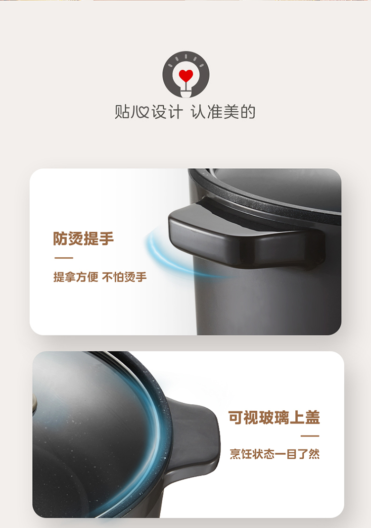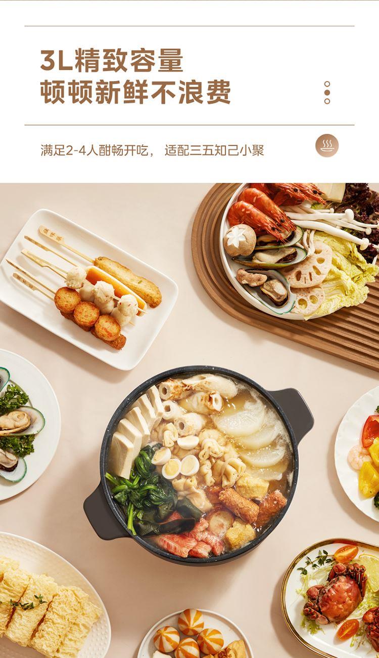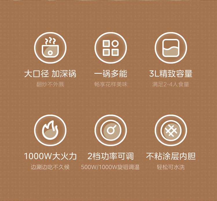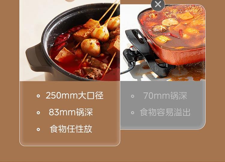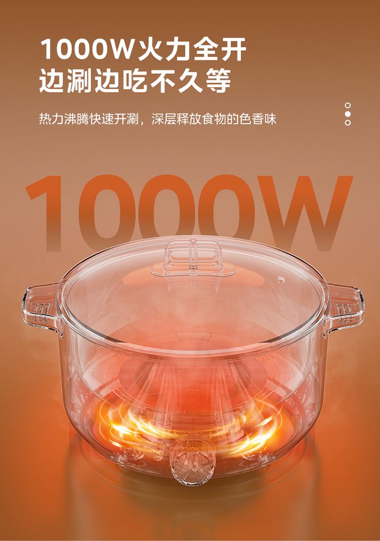 產(chǎn)品規(guī)格: 產(chǎn)品尺寸:305 x 253 x 215 mm 包裝尺寸:290 x 195 x 300 mm 產(chǎn)品毛重:2 kg 產(chǎn)品特點: 1000W快速沸騰,毛肚羊肉涮起來 加深內(nèi)膽,實用容量,3-5人可食用 不粘涂層內(nèi)膽,,不粘鍋好清洗 一鍋多能,暢享花樣美味