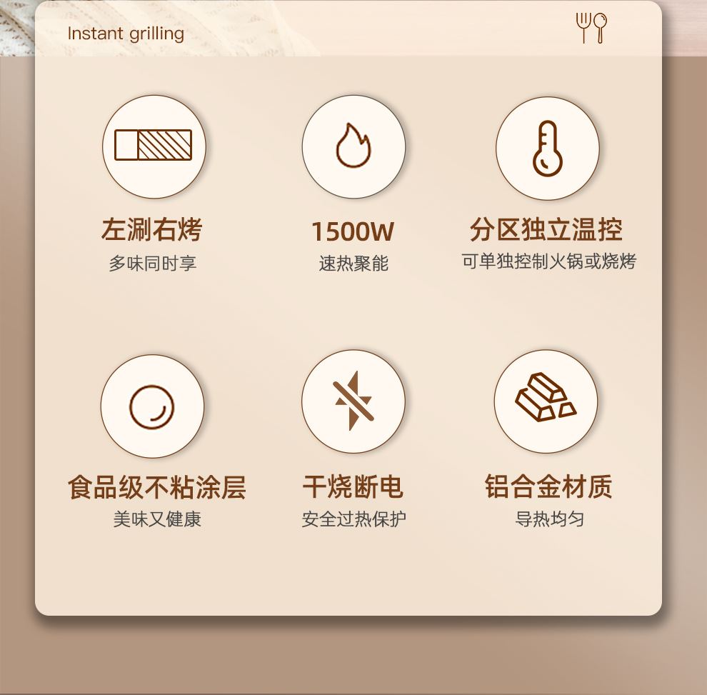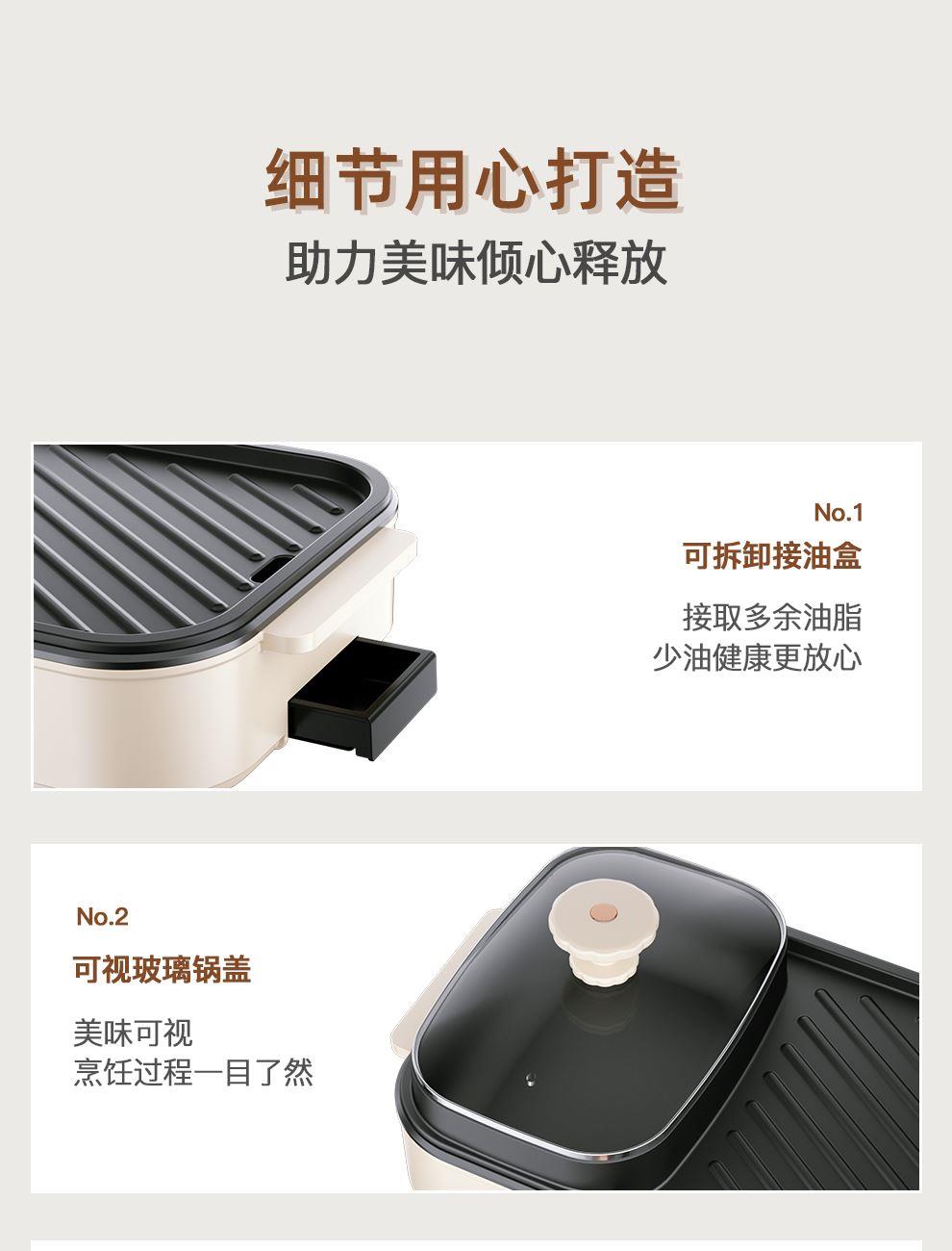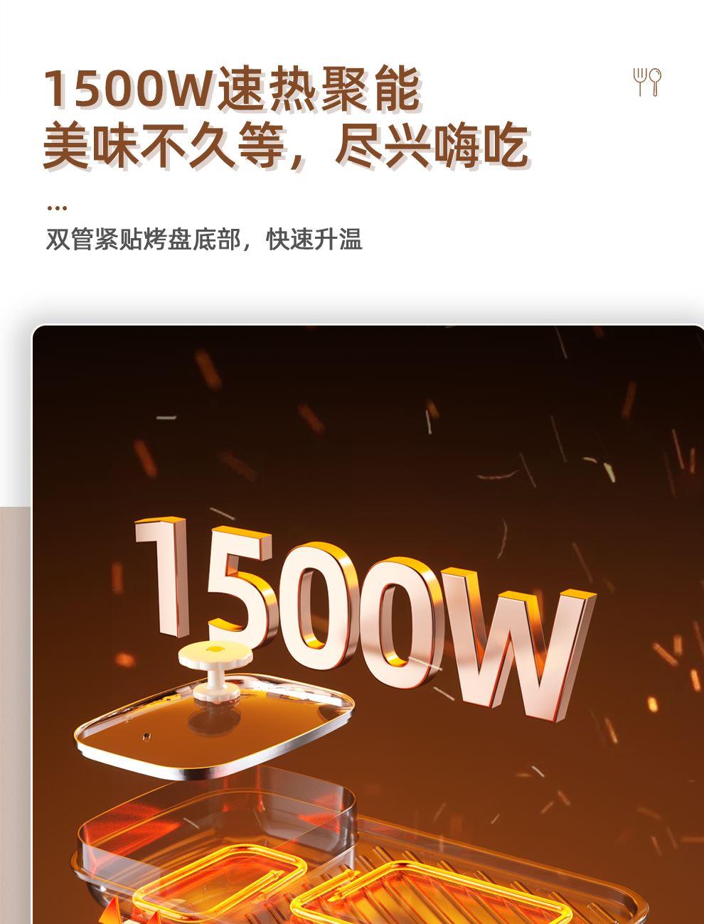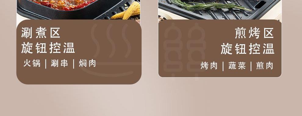 額定功率:1500W 產品容量:1.5L(火鍋) 額定電壓:220V~ 產品頻率:50Hz 產品凈重:2.1kg 產品毛重:2.6kg 整箱重量:21.7kg 裝 箱 數:8臺/箱 一體壓鑄鋁合金一體壓鑄、物理不粘烤盤火鍋,一鍋多用 可視烹飪不銹鋼包邊耐高溫玻璃火鍋上蓋 雙鈕雙控雙旋鈕溫控獨立控溫、分區(qū)控制 多重安全防護優(yōu)質溫控器,干燒保護