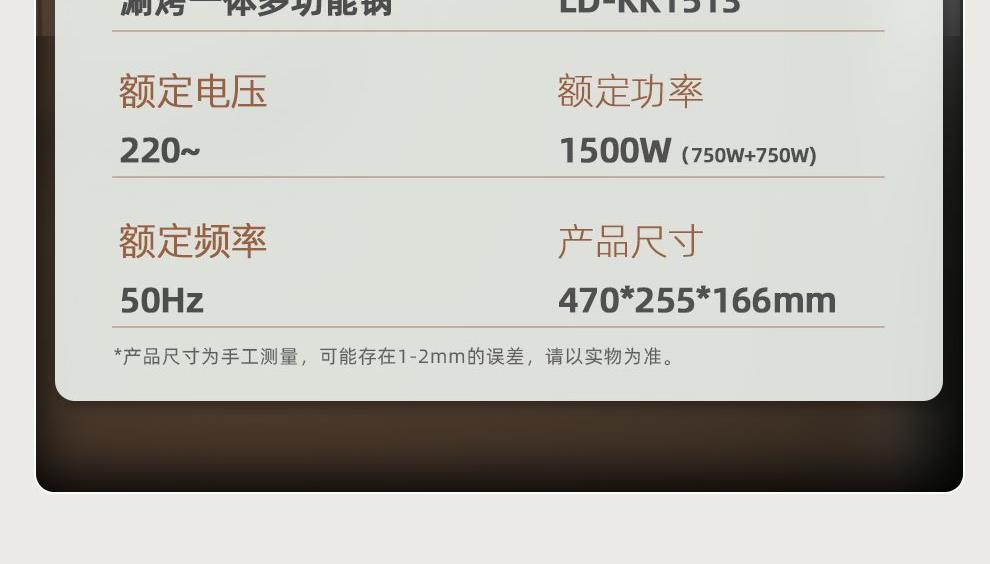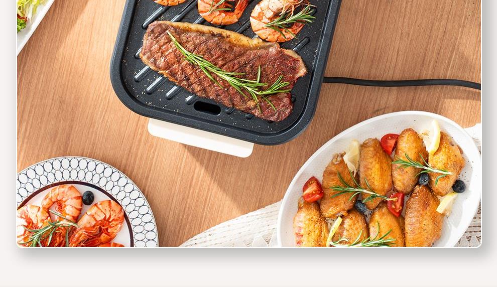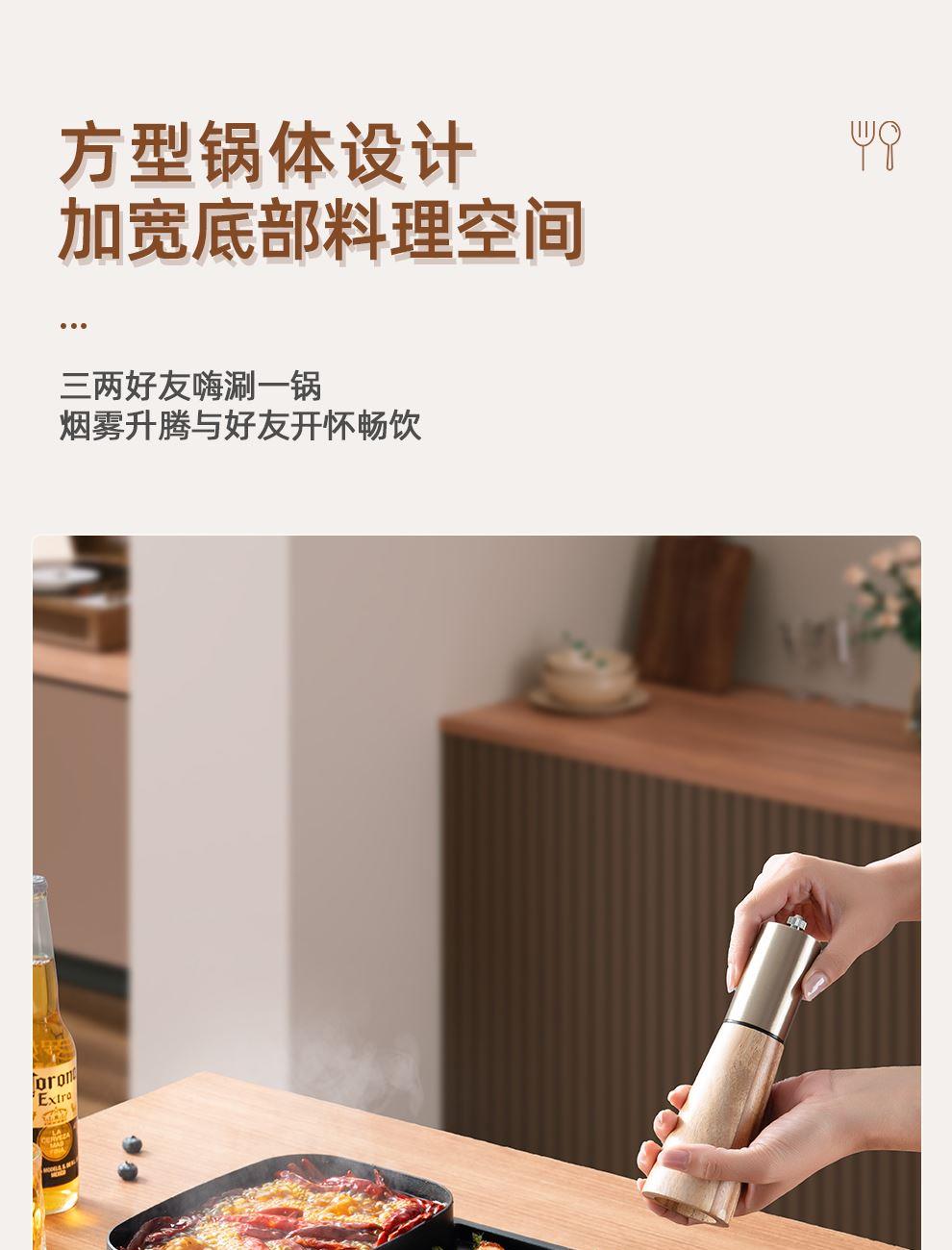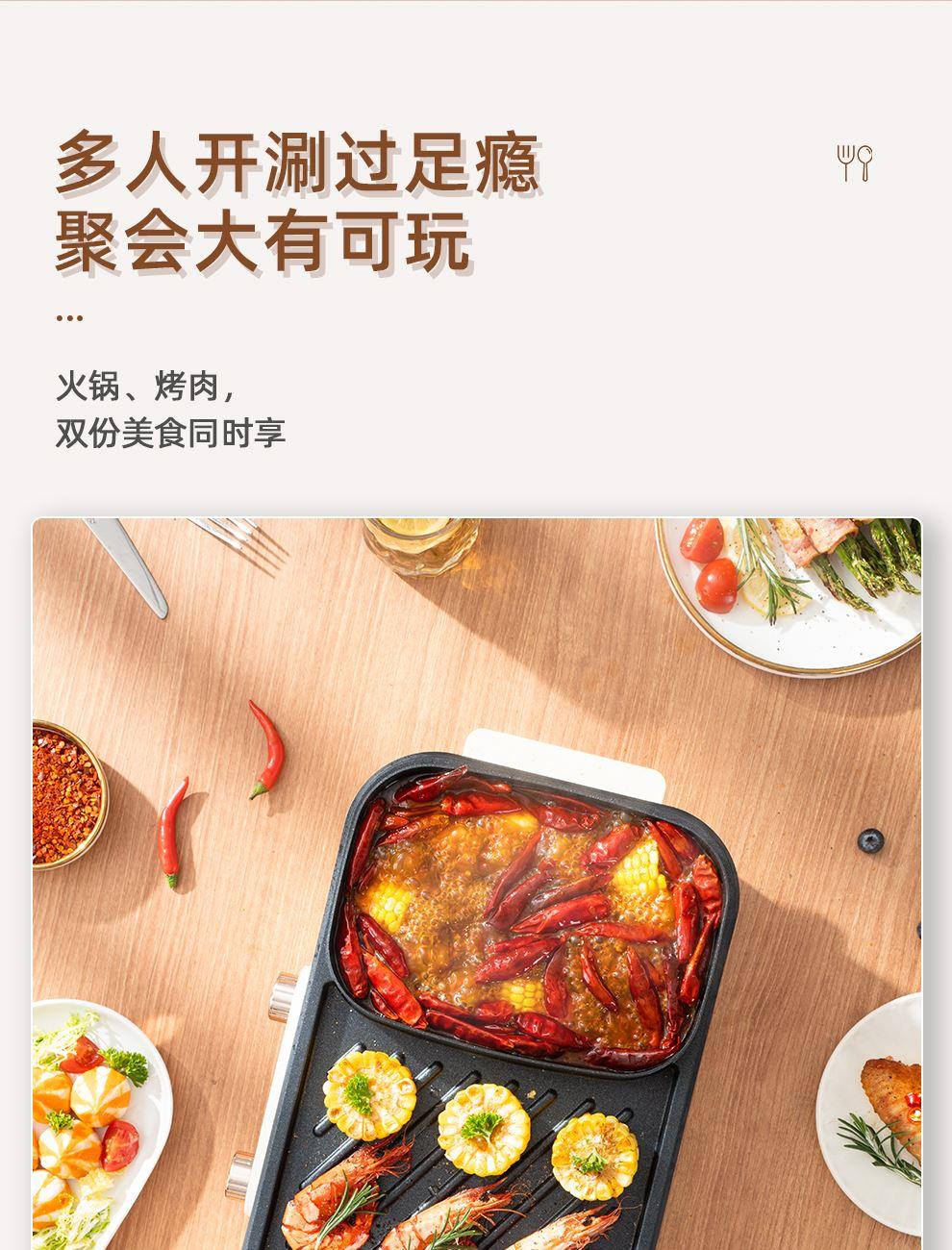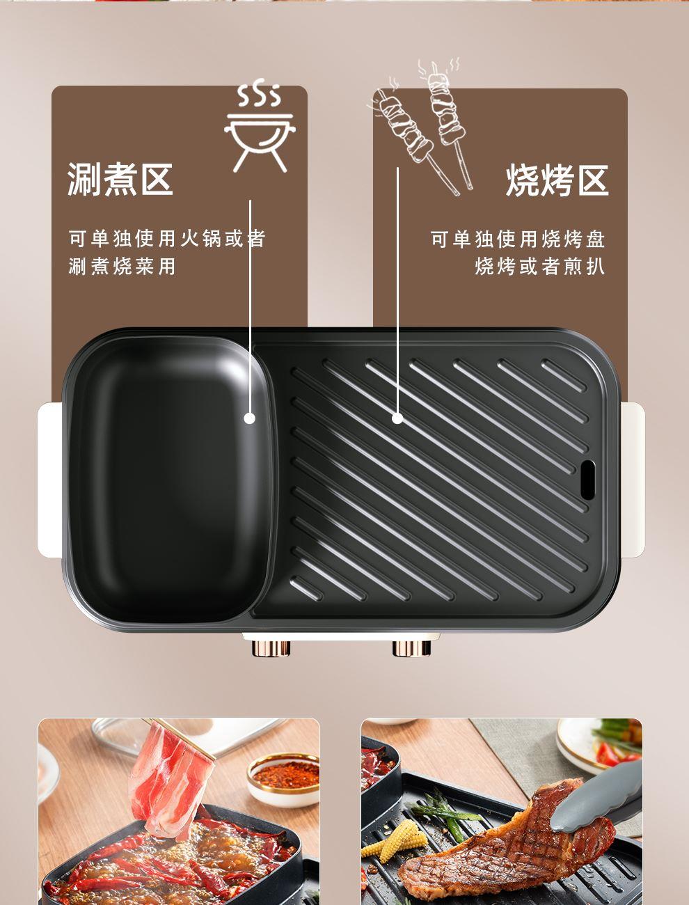 額定功率:1500W 產品容量:1.5L(火鍋) 額定電壓:220V~ 產品頻率:50Hz 產品凈重:2.1kg 產品毛重:2.6kg 整箱重量:21.7kg 裝 箱 數:8臺/箱 一體壓鑄鋁合金一體壓鑄、物理不粘烤盤火鍋,一鍋多用 可視烹飪不銹鋼包邊耐高溫玻璃火鍋上蓋 雙鈕雙控雙旋鈕溫控獨立控溫、分區(qū)控制 多重安全防護優(yōu)質溫控器,干燒保護